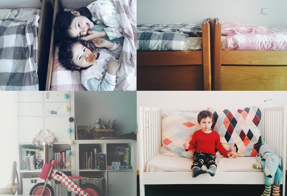 Depois veio a fase do beliche, nesta altura achei que tínhamos um bom compromisso, os miúdos adoraram a cama, mas eu "perdi" dois grandes gavetões de arrumação. O bercinho regressou ao quarto para funcionar como sofá, onde lemos muitas histórias antes de dormir. Entretanto há poucas semanas o berço foi para Lisboa porque a família vai crescer novamente (yey!!!!) e o quarto ficou mesmo muito vazio em metade do quarto e com a mobília toda "encostada" na outra metade. Não estava a ficar bem, o quarto estava demasiado desequilibrado e a solução foi testar uma versão que há muito tempo já nos sugeriam: ter as camas lado a lado.